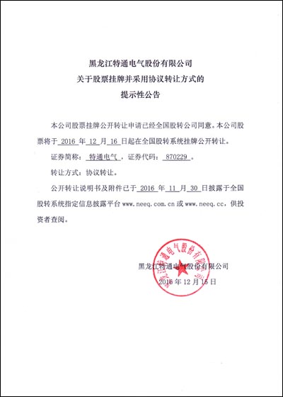 熱烈祝賀黑龍江特通電氣股份有限公司新三板成功掛牌上市