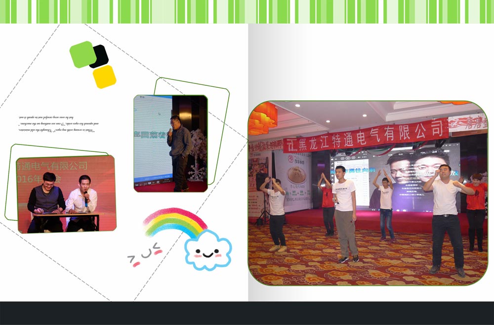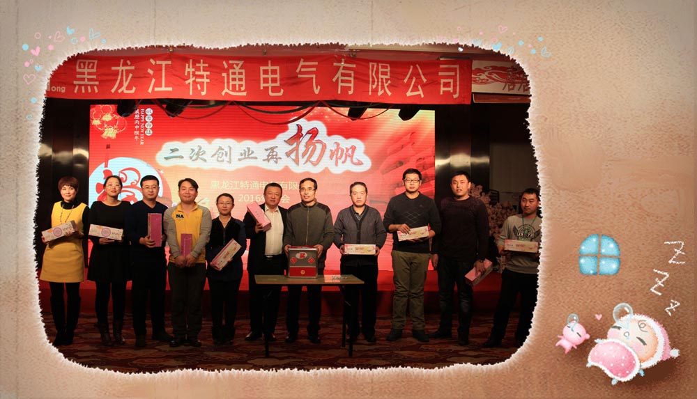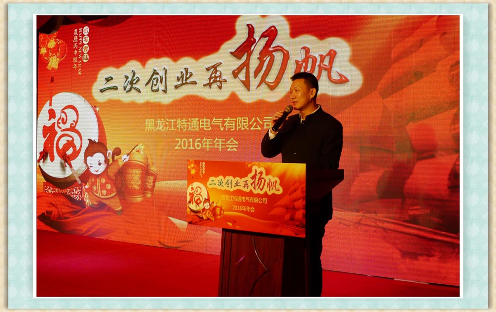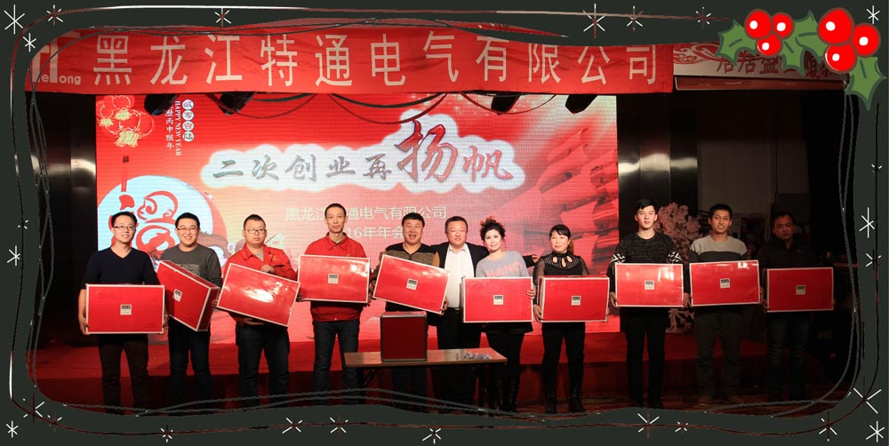 "二次創(chuàng)業(yè)再揚(yáng)帆",特通電氣2016年1月8日新年年會(huì)拉開序幕,特通電氣全體員工歡聚一堂,共享這一美好佳節(jié)。年會(huì)在大家的歡笑中開始,首先由李國勇總經(jīng)理發(fā)表了熱情洋溢的新春賀詞,總結(jié)了過去一年中公司取得的成績,并鼓勵(lì)大家努力奮進(jìn),創(chuàng)造價(jià)值、分享成果,為特通取得更加輝煌的成就而奮斗。李總還給員工及家人帶去了美好的祝福和獎(jiǎng)勵(lì)。接下來,大家載歌載舞開始了一系列精彩的節(jié)目及頒獎(jiǎng)。
